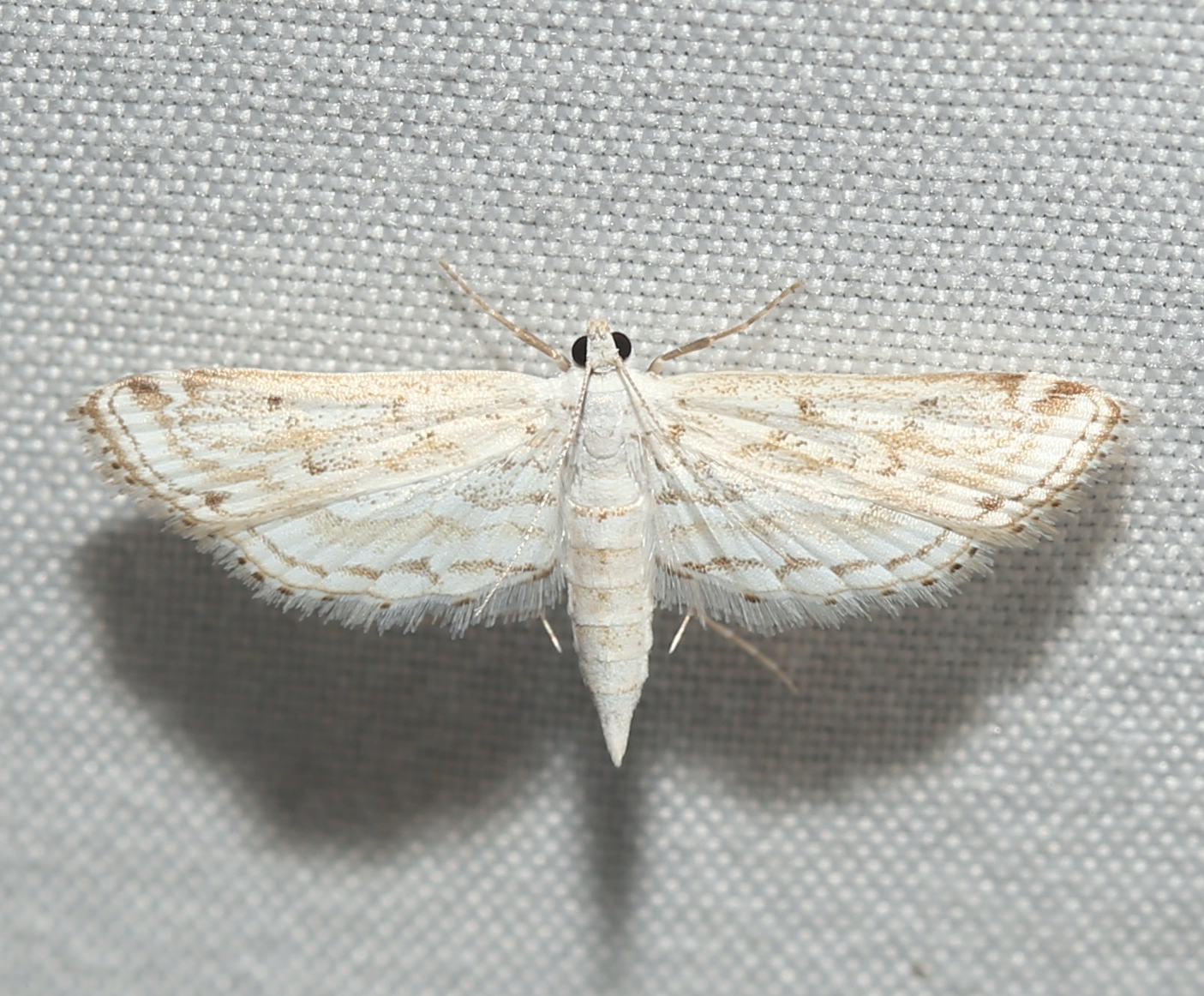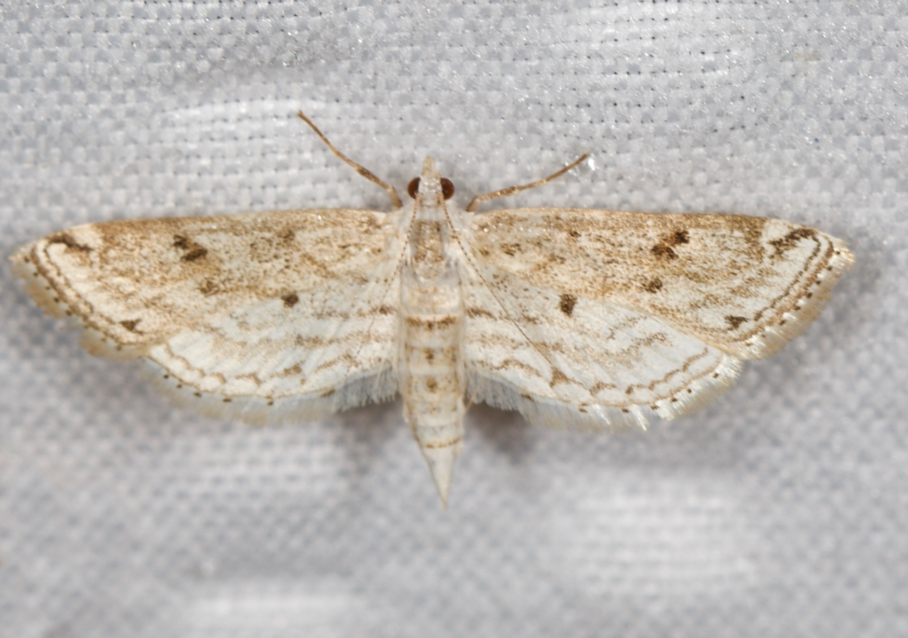 Adult Markings: This species is variable in coloration and patterning, with individuals ranging from being nearly white to uniformly dark brown. The forewing of well-marked individuals often show evidence of an oblique, wavy, fuscous or blackish antemedial line, a slightly stronger but similar postmedial line, a wide brownish to reddish-brown subterminal band, and a thin, black terminal line that parallels the outer margin. The hindwing commonly has four fine irregular parallel black lines, with the outermost the thinnest and similar to the black terminal line on the forewing. A wide brownish to reddish-brown subterminal band is also often present that matches the one on the forewing. Munroe (1972) noted that most specimens have fuscous dots on the discocellulars of both the forewing and hindwing, along with a fuscous dot in the cell of the forewing. These are unique to this species and are not present in any other North American Paraponyx species. In poorly marked specimens all of the markings above may be lost except for the dark discocellular spots of the forewing and hindwing, and even these spots may be only feebly indicated.