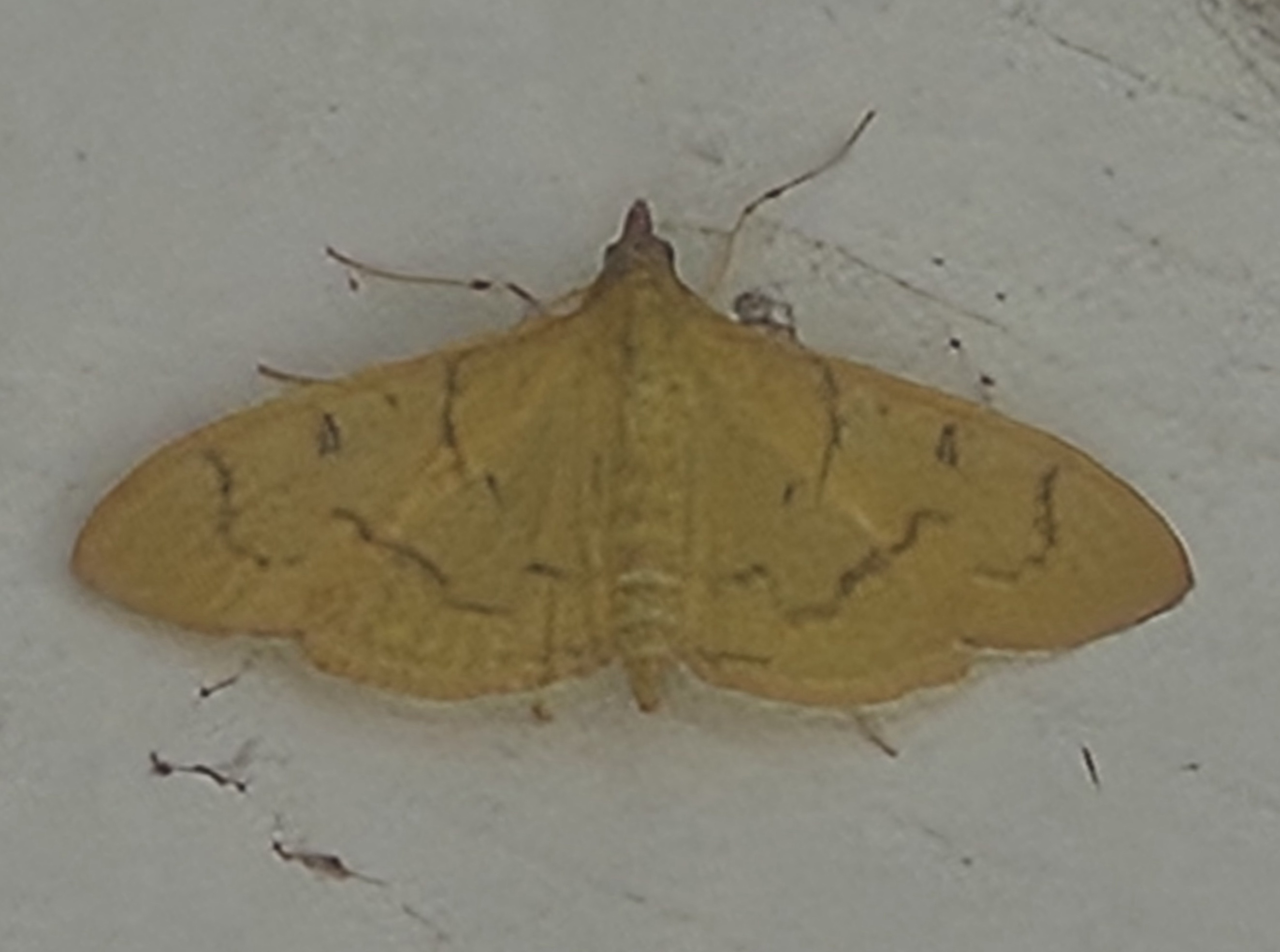 The adults typically have a medium yellow ground color on both the forewing and hindwing, but can also rarely be light brown or luteous, diaphanous green (Brou, 2017). The marks on the forewing are all brown and often lightly patterned. They include an antemedial line that is slightly curved outward, an orbicular dot, and a reniform that resembles a quotation mark. There is a stepped postmedial line that extends perpendicular from the inner margin, then angles at around 90 degrees to run parallel to the inner margin before angling again to run parallel to the termen. From there is projects obliquely inward to the costa. The hindwing has a very similar postmedial line, along with a somewhat diffuse, dark, dashed or solid line that parallels the dashed terminal line. The fringe on both wings is whitish, and the head, thorax and abdomen are concolorous with the wing ground color.