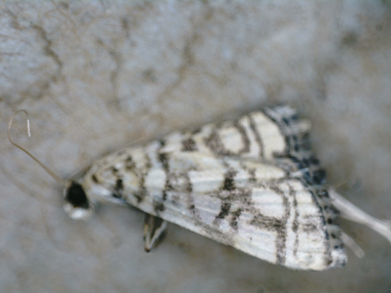 This is a very distinctive species that has a dull white to pale yellowish-white ground color on both the forewing and hindwing. Both wings have a complex, reticulated pattern of dark brown to brownish-black lines that often anastomose to create either irregular or roughly oval patches of ground color. The subterminal region has a pair of transverse lines that run nearly parallel to one another, but diverge slightly towards the costa. The fringe is checkered with brown and dull white, and there is an interrupted dark line near the base that parallels a solid dark terminal line. The abdomen is mostly dull white with thin, dark-brown crossbands.