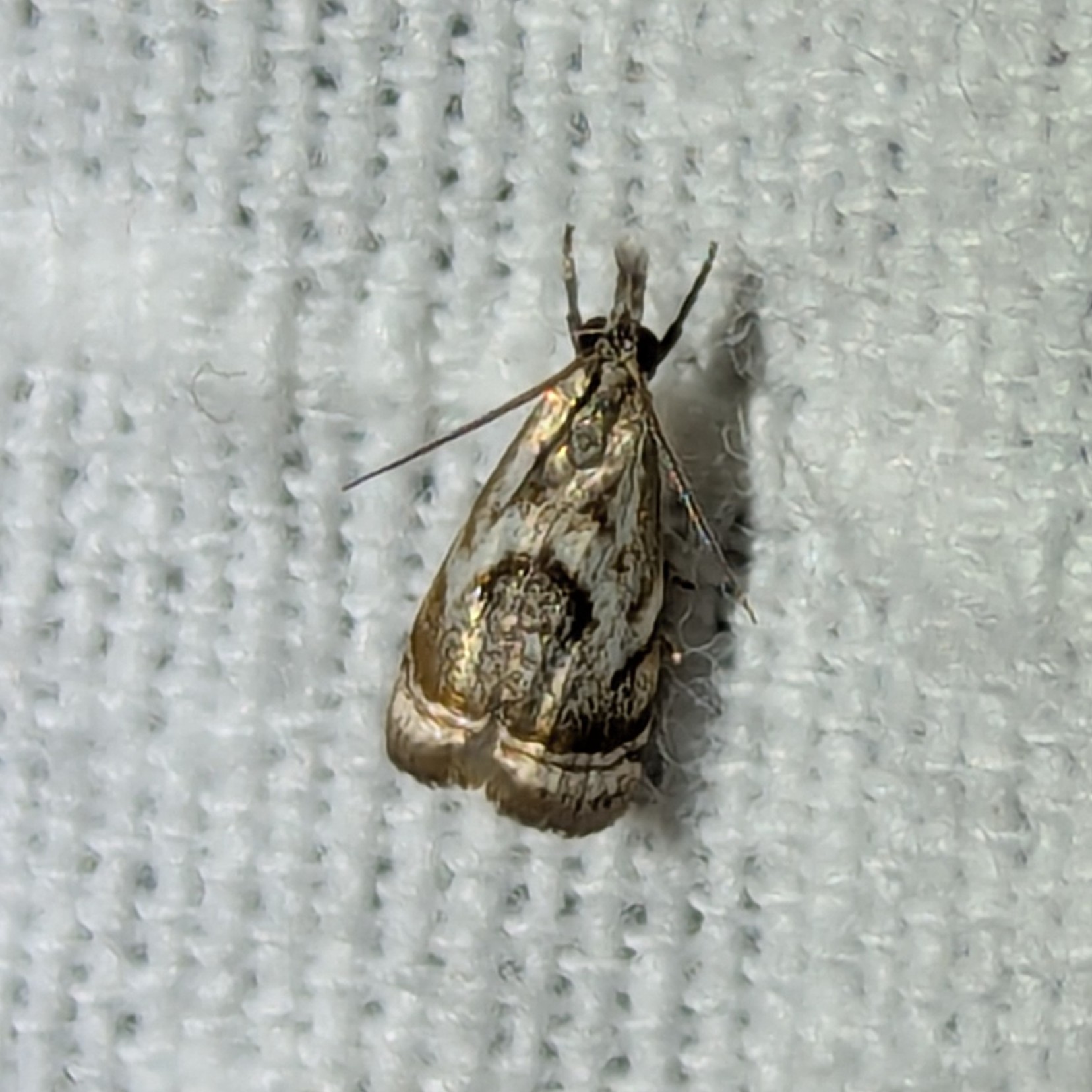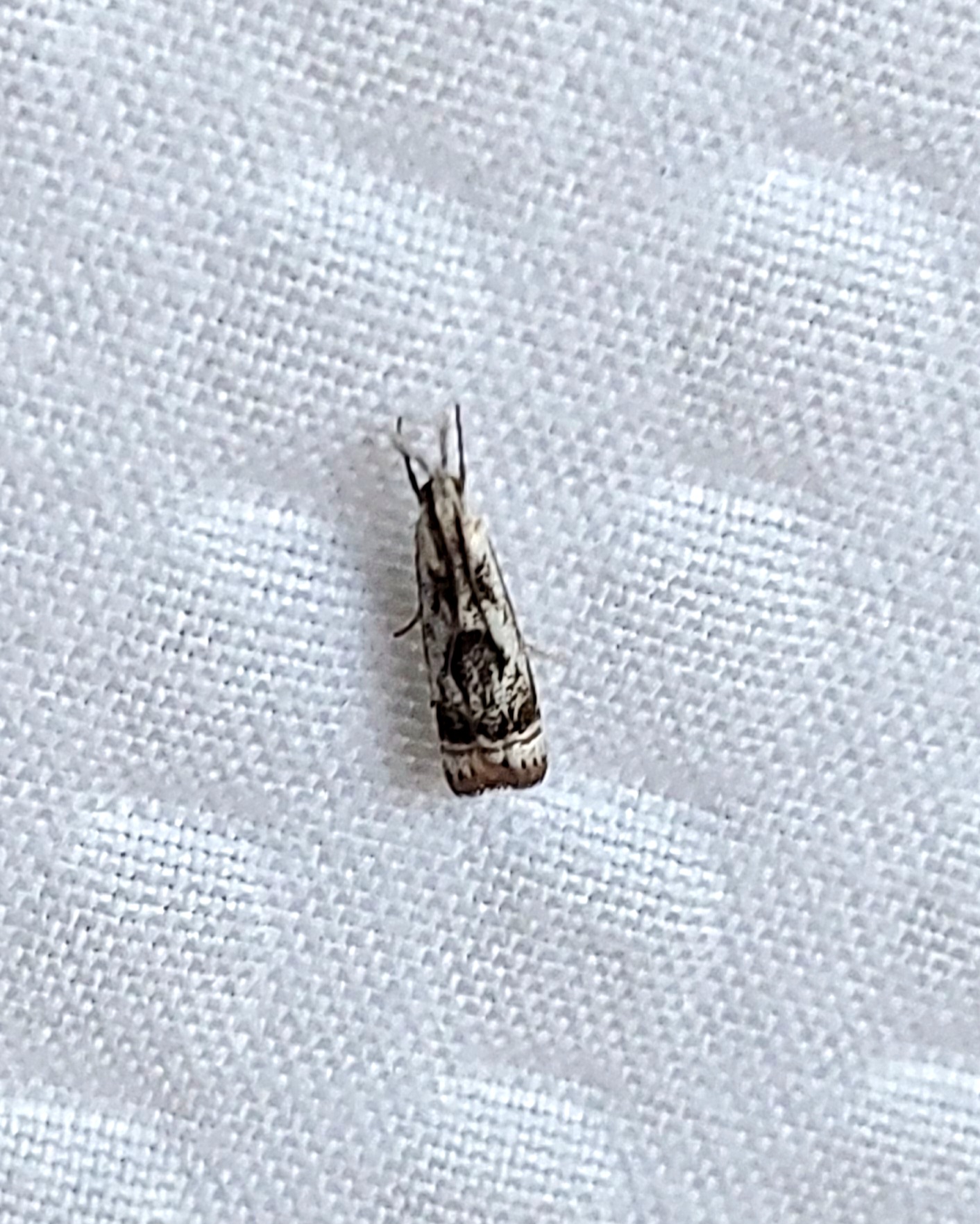 Adult Markings: The following description is based mostly on that of Fernald (1896) and Forbes (1923). The palps are white above and slightly fuscous on the outside. The head and thorax are white with dull brown dusting. The ground color of the forewing is white and is heavily shaded with dull brown in places, particularly on the apical third of the wing before the subterminal line, along the basal two-thirds of the costa, and as a blackish-brown basal patch near the base of the wing. A wide white fascia is present at the middle of the wing that begins near the middle of the costa and extends obliquely outward for about one-fourth of its length, then angles sharply backwards and runs to the inner margin at around one-third the wing length. It often fuses with a diffuse, narrow, white streak that runs from near the middle of the wing base to the fascia. The white fascia adjoins a short, curved, diffuse, blackish streak on the dorsal half that forms a semicircular or horseshoe-shaped band when an individual is resting with the wings closed. The subterminal line is brown and slightly excurved, and is preceded by a parallel, white line that is the same width. The area between the middle white fascia and the subterminal line is heavily dusted with dull brown except for a white costal spot at around three-fourths the wing length. The subterminal area beyond the subterminal line is white, but sometimes has a light dusting of dull brown scales. The terminal line is represented as a line of seven black dots, and the fringe varies from metallic ashy-gray to light-brown. The hindwing varies from light-brown to light reddish-brown and has a lighter fringe.