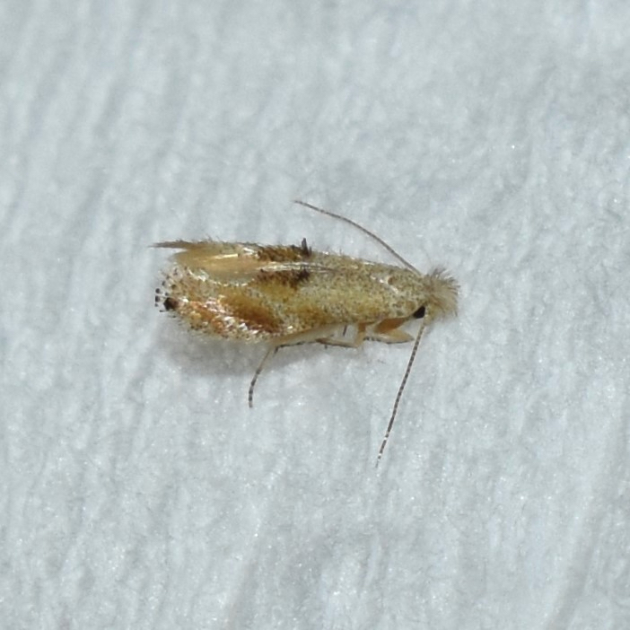 Adult Markings: This is a tiny moth with an orangish forewing that has diffuse, white bands, heavy dark speckling and a dark apical spot. It resembles some of our other Bucculatrix , but can be distinguished by having the face and antennal eye-caps speckled with darker marks. The following detailed description is mostly based on that of Braun (1963) from the type series from Ohio.