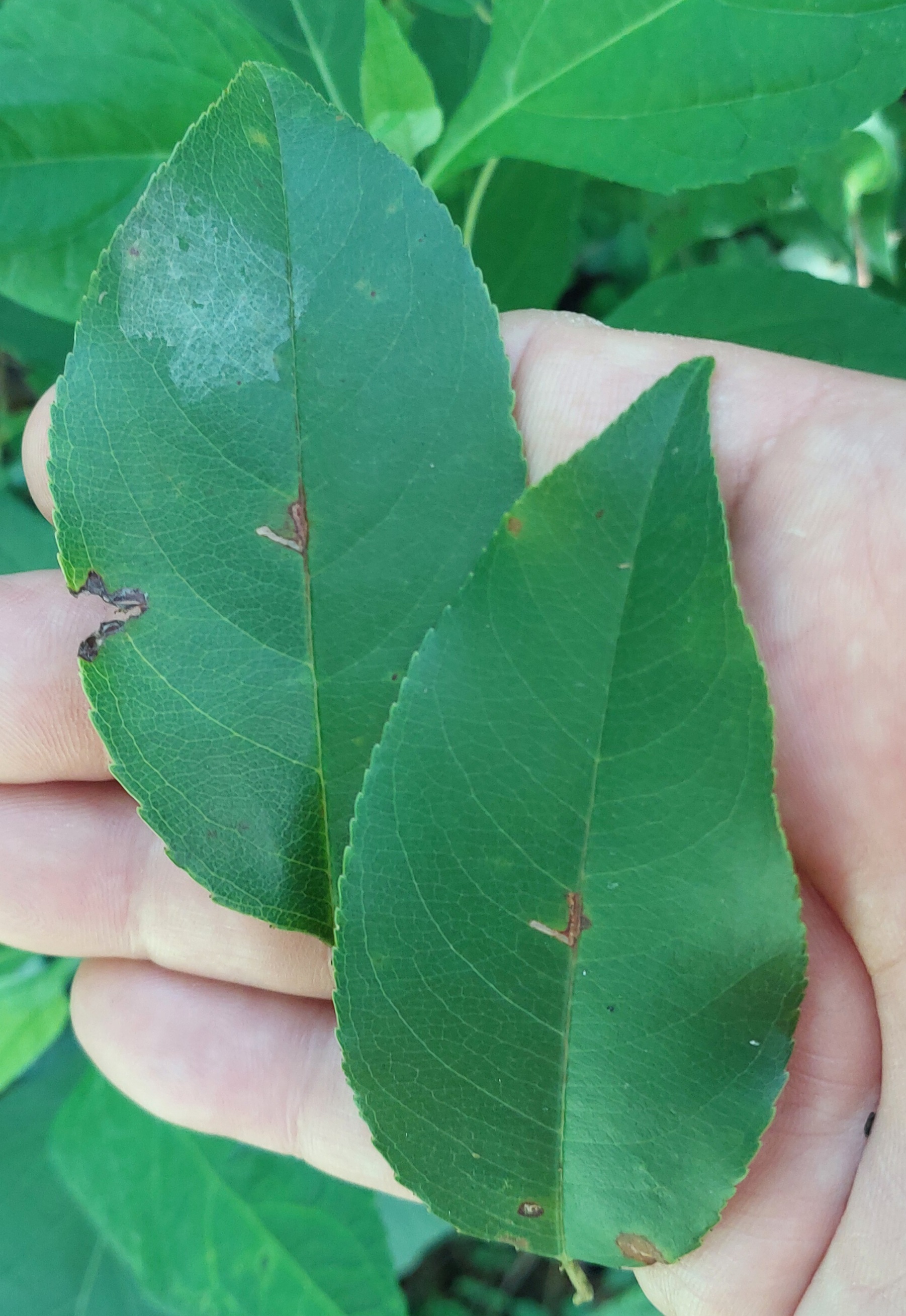 Immatures and Development: The larvae mine the leaves of apples, cherries, and related species. The egg is deposited on the lower leaf surface next to the midrib. The hatchling initially produces a fine linear mine that follows the midrib or a major lateral vein. It then diverges away from the midrib or vein, where the track often becomes more convoluted. At the end of the third instar, the larva leaves the mine through the upper epidermis and produces a circular molting cocoon that is usually on the upper leaf surface. The last instars are green with reddish shading, and feed with rare exception on the upper side of the leaf where they eat out irregular patches of tissue (Slingerland and Fletcher, 1903; Braun, 1963). The lower epidermis is left intact, which then shows as an iridescent patch. The iridescent patches are characteristic evidence of the presence of B. pomifoliella (Braun, 1963).