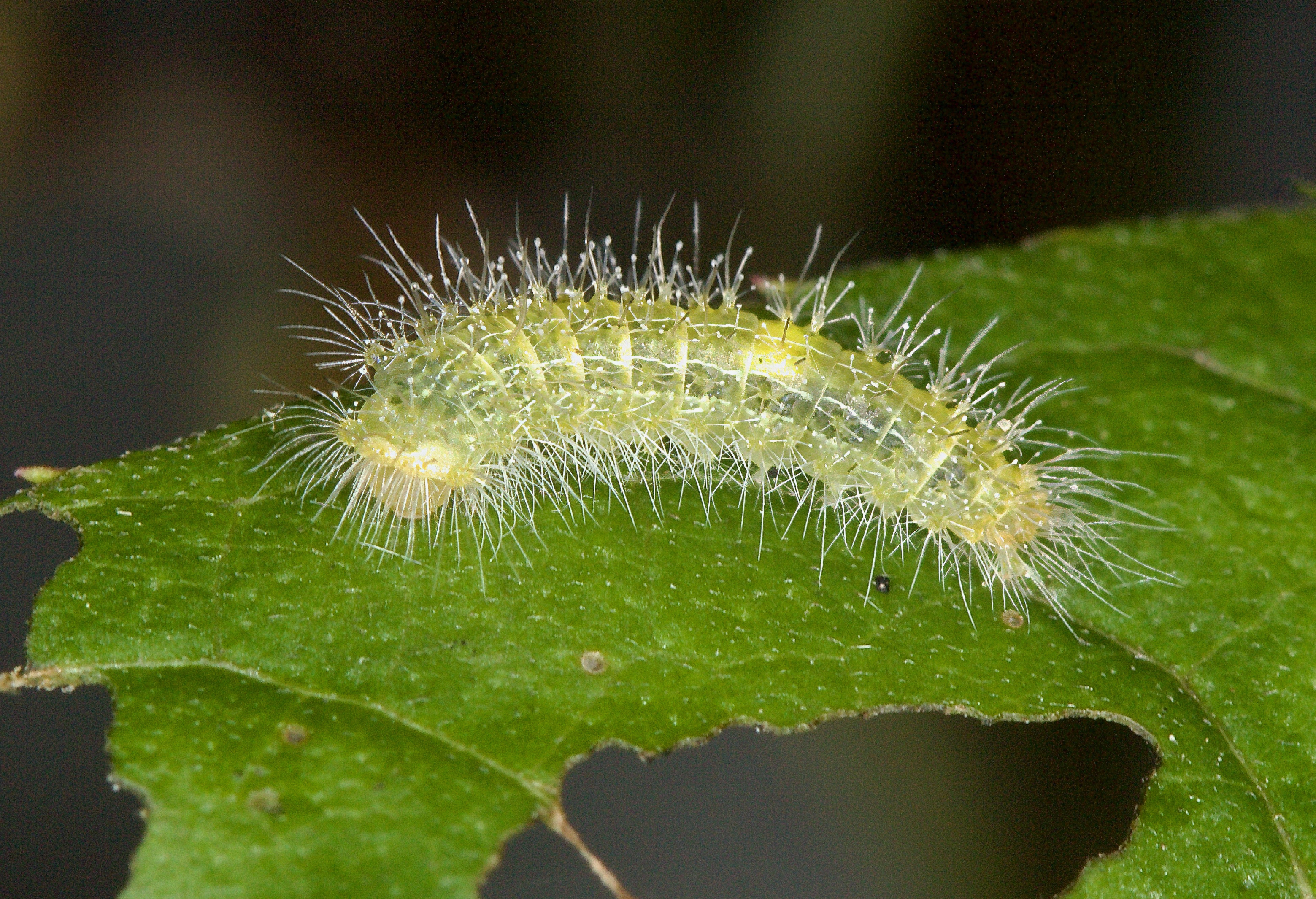 A larva that was on New York Ironweed; note the capitate setae at the bases of the larger clusters of hairs that resemble pinheads.