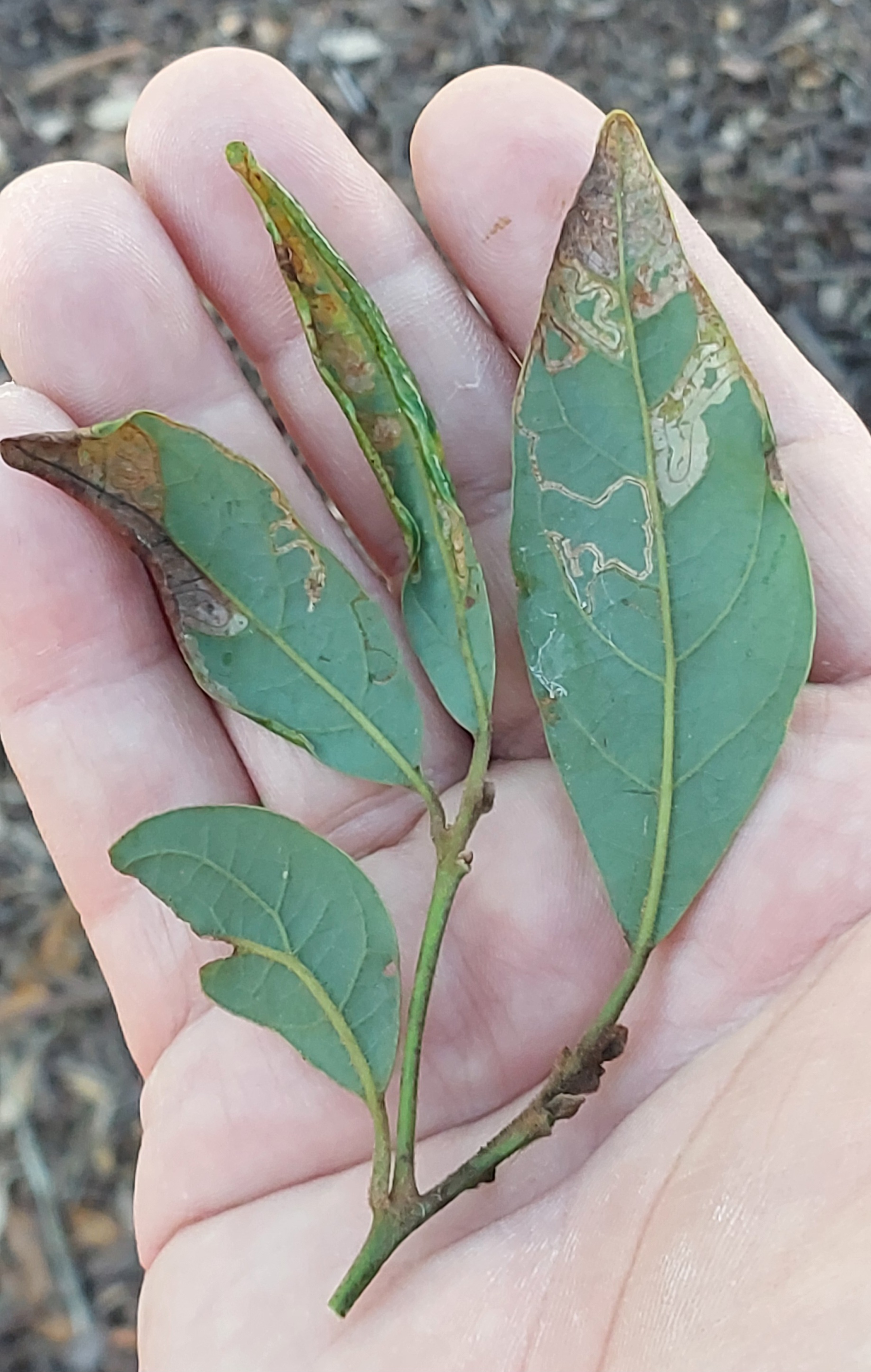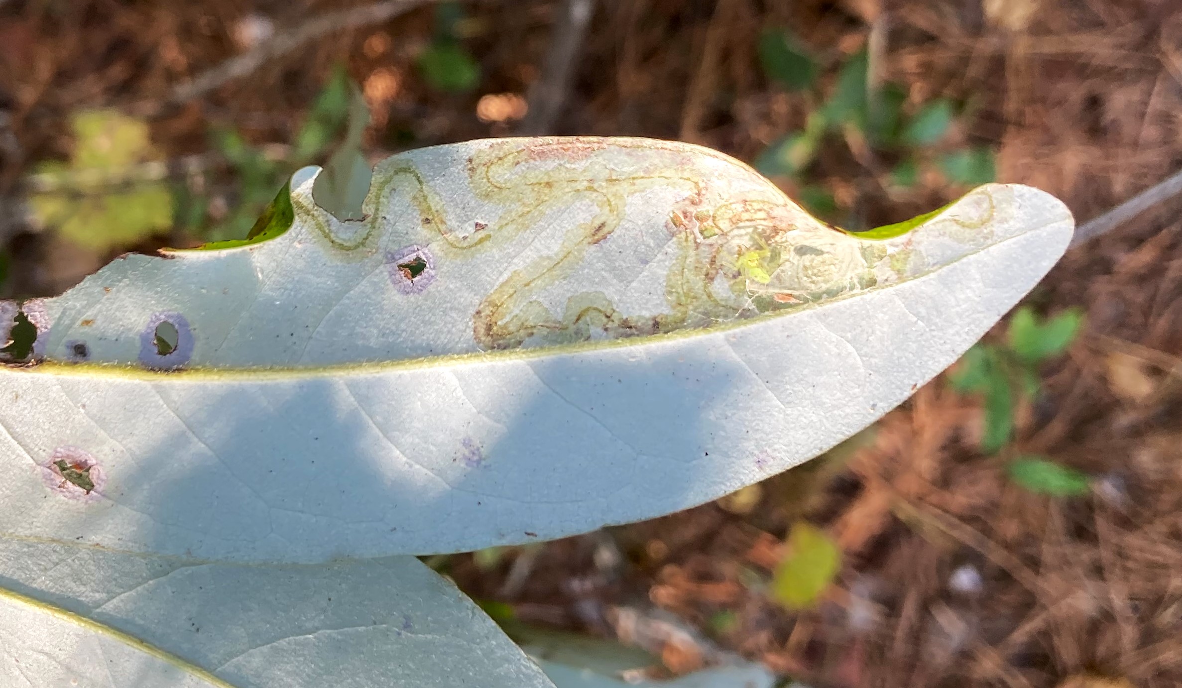 A mine on the underside of a Persea leaf that shows the thin frass trail. Note how the egg was laid away from the midrib, and the terminal chamber is at the leaf margin.