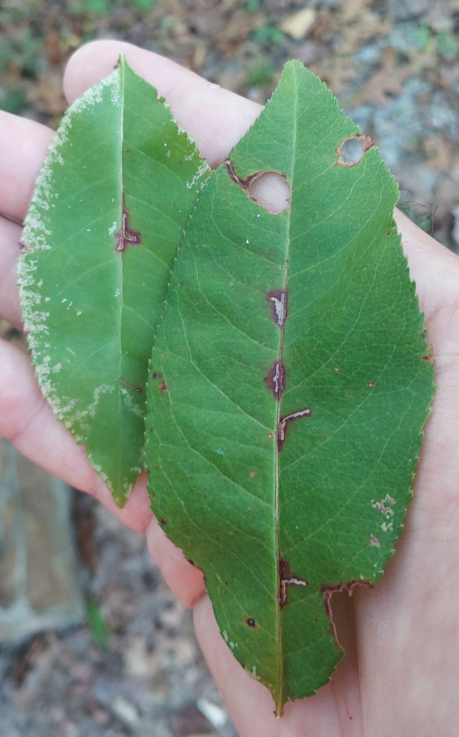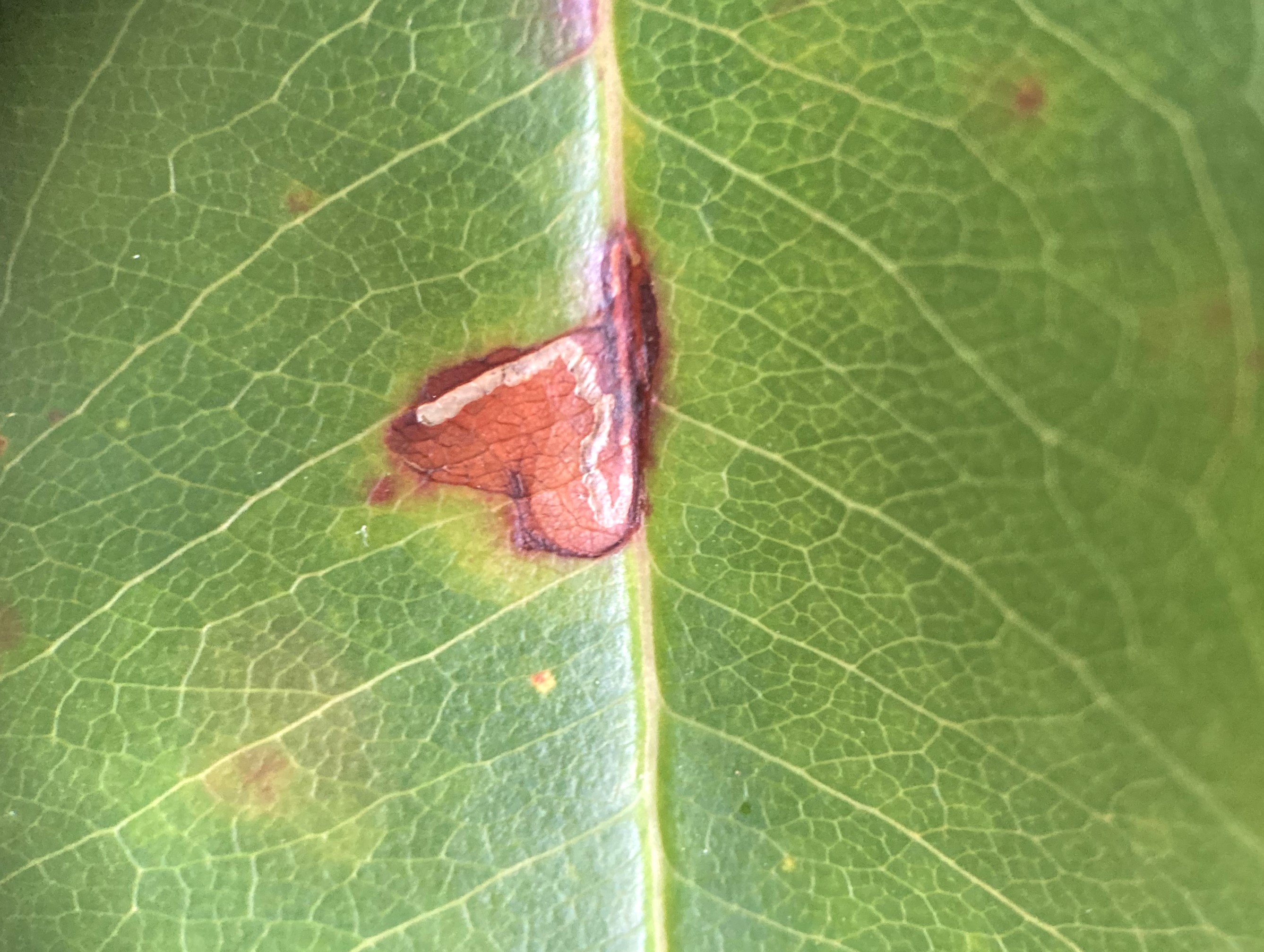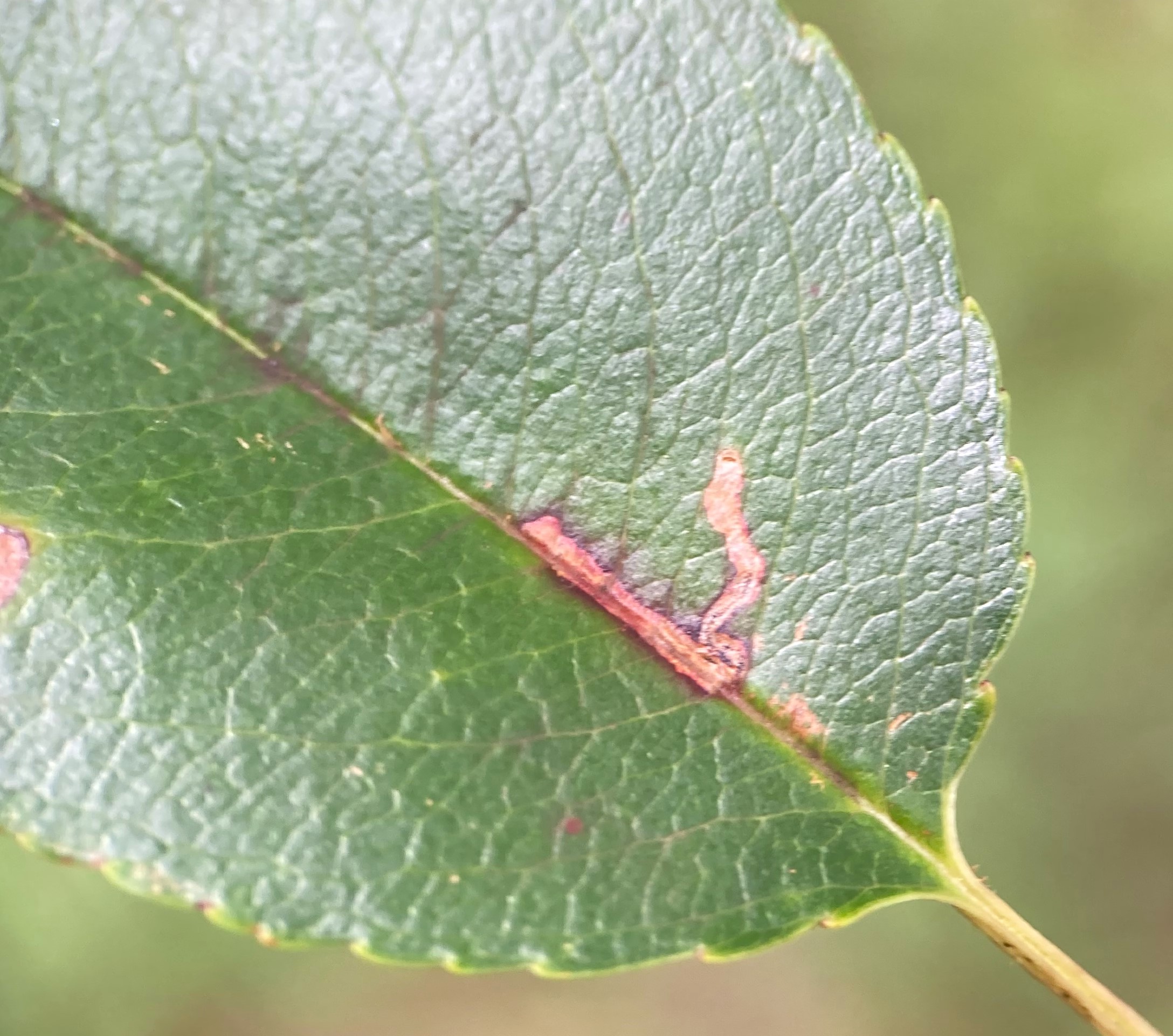 Immatures and Development: The larvae mine the leaves of apples, cherries, and related species. The egg is deposited on the lower leaf surface next to the midrib. The hatchling initially produces a fine linear mine that follows the midrib or a major lateral vein. It then diverges away from the midrib or vein, where the track often becomes more convoluted. At the end of the third instar, the larva leaves the mine through the upper epidermis and produces a circular molting cocoon that is usually on the upper leaf surface. The last instars are green with reddish shading, and feed with rare exception on the upper side of the leaf where they eat out irregular patches of tissue (Slingerland and Fletcher, 1903; Braun, 1963). The lower epidermis is left intact, which then shows as an iridescent patch. The iridescent patches are characteristic evidence of the presence of B. pomifoliella (Braun, 1963).