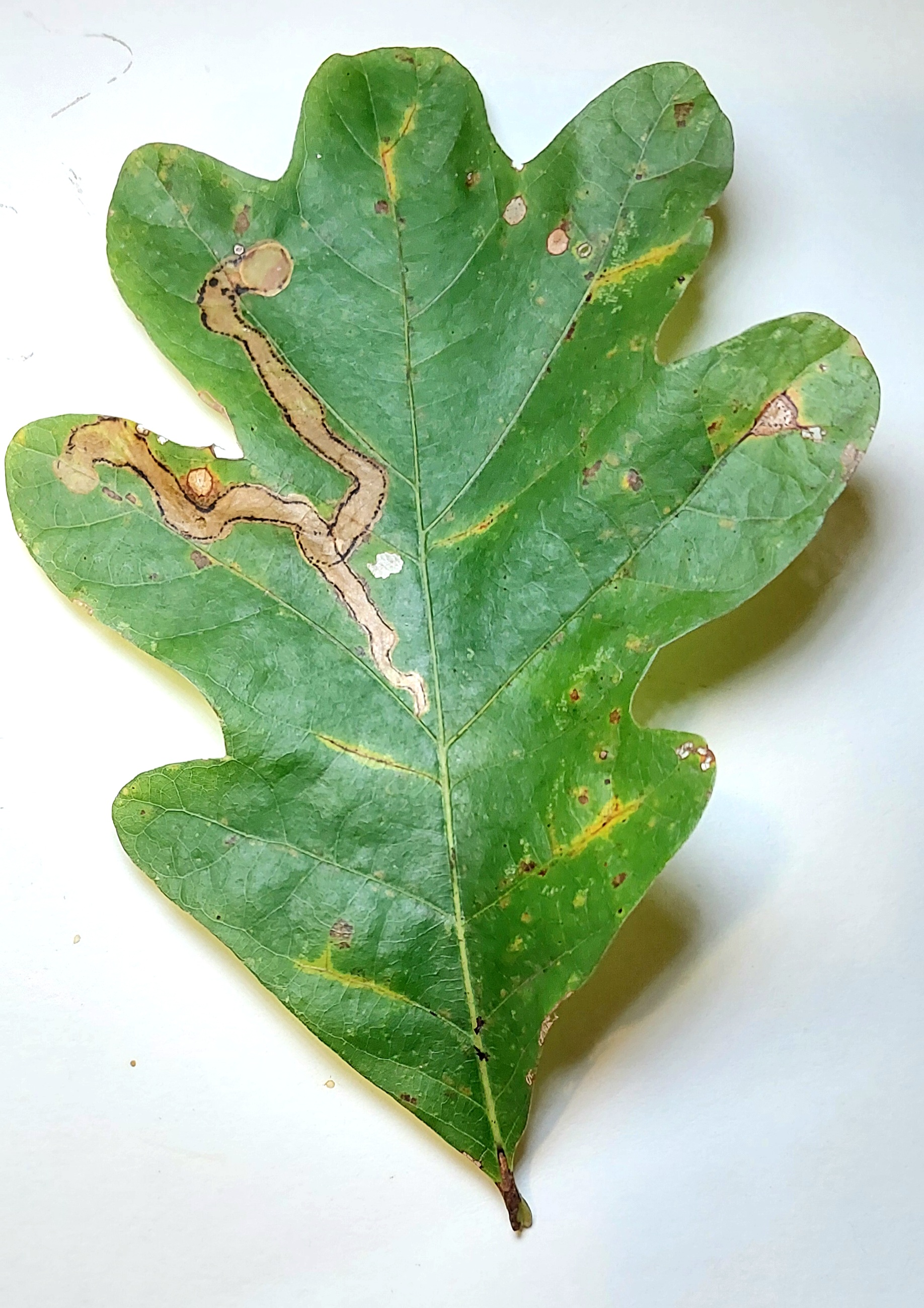 The larvae mine the upper surfaces of oak leaves. They produce broad linear tracks that gradually increase in width and that are often curved or wavy. A larva typically orients transverse to the direction of the mine and deposits a rather thin line of blackish frass along the edges on both sides (Clemens, 1960; Braun, 1908; Eiseman, 2019). It will sometimes return to the lower portion of the mine and create a new pathway that produces a branched pattern to the mine. Pupation occurs at the end of the mine in a circular cell that is slightly lined with silk. The larva has a blackish brown head and a pale greenish body with pale brown dorsal maculae. Clemens (1860) noted that the fall brood overwinters as pupae and the adults emerge about the middle of May.