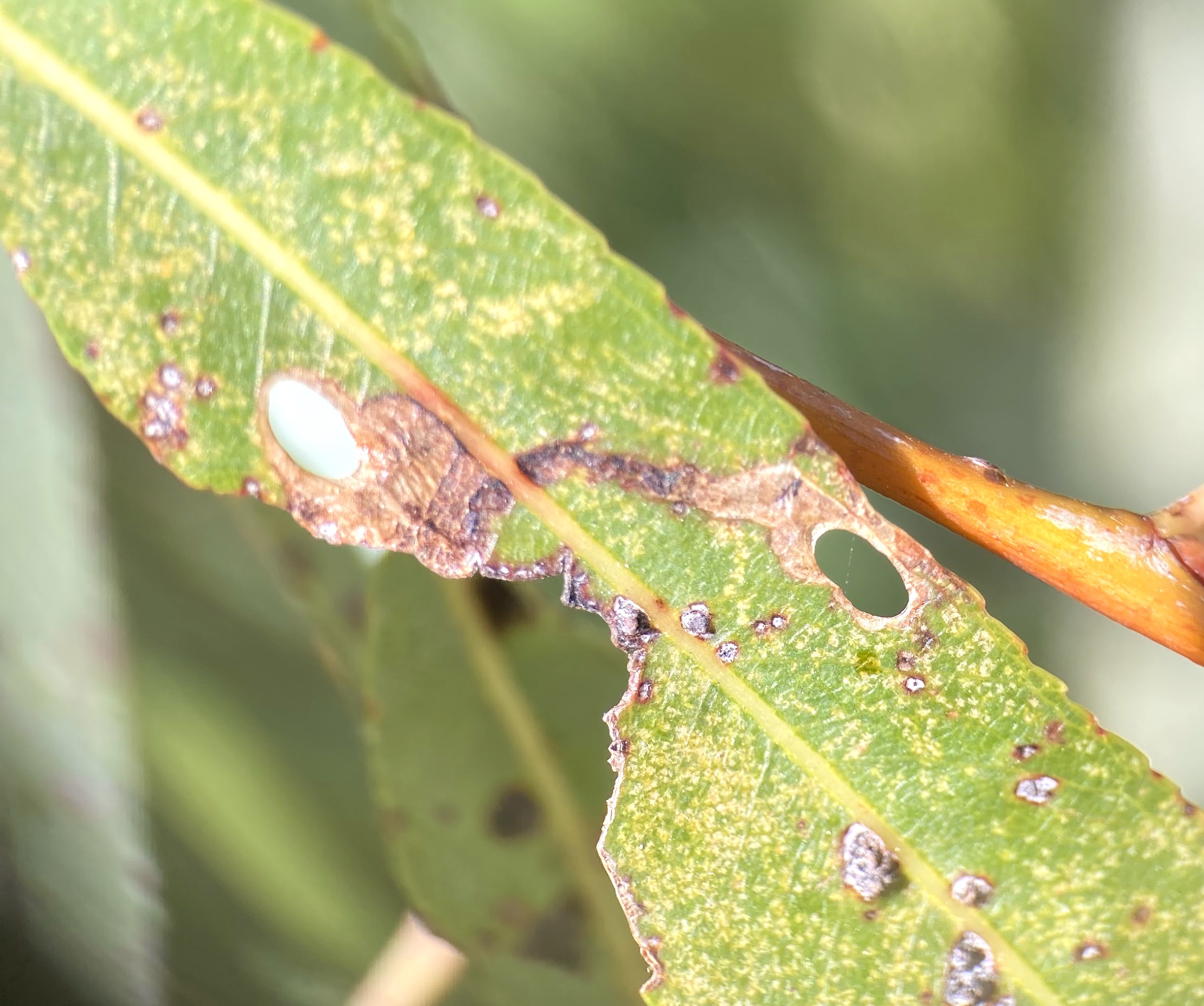 | Recorded by: Tracy S. Feldman on 2018-07-25 Wake Co. Comment: An empty mine on Salix nigra. Larvae produce tiny widening linear mines like this one and cut elliptical holes at the ends. The excised leaf segments are used to construct a pupal case. |
