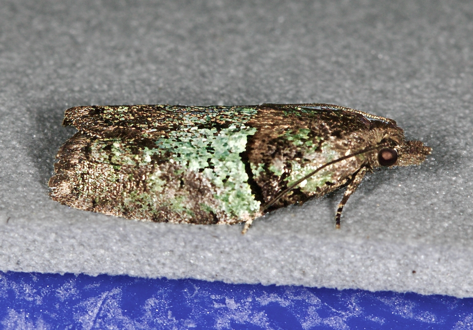 This is a distinctive species with a forewing that has a relatively dark basal patch and a broad greenish median band that fades into greenish-gray mottling on the apical third. The following detailed description is based in part on that of Kearfott (1908a) who examined specimens from southern Canada and Pennsylvania. The head, palp, antenna and thorax are light mouse-gray. The forewing has a pale, apple-green, median band with darker sparse speckling that fades to darker greenish-gray shades on the apical third of the wing. A narrow blackish line separates the median band from the darker basal third that has a mixture of green and brown patches. A second, shorter black line occurs basal to the first that extends from the costal to the fold. The cilia are dark gray and the hindwing brownish gray.