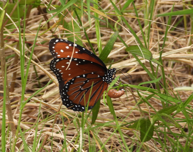 DistributionDISTRIBUTION: Though there are scattered records over the Coastal Plain and eastern Piedmont, it is primarily seen along and near the southern coast. The record from Durham County likely relates to an escaped individual, as the species is kept at butterfly houses and as several observers have actually seen free-flying Queens outside the houses on the grounds of the N.C. Museum of Life and Science. However, the Wake County record came in 1935, long before butterfly houses. Remarkably, in summer 2019, a larva was photographed in the wilds of Buncombe County (in the Mountains), and the pupa it formed was also photographed; experts confirmed the identification.
