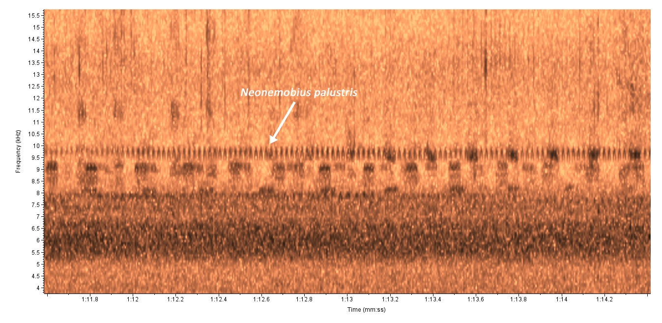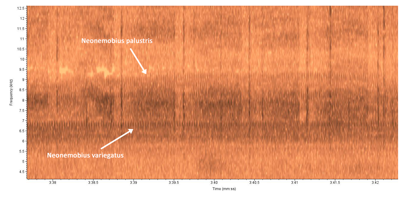 Neonemobius variegatus Variegated Ground Cricket | ![]() | 149.0 | Richmond | 2025-10-02 | 1 | DSD,SONG | PLND | Steve Hall and Bruce Sorrie | 2 | Photo | ||||