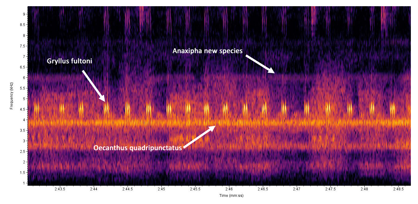 Recorded by: Steve Hall Orange Co. Comment: Recorded out in a field close to where Gryllus rubens was also singing (constant trill in the background at about the same pitch)