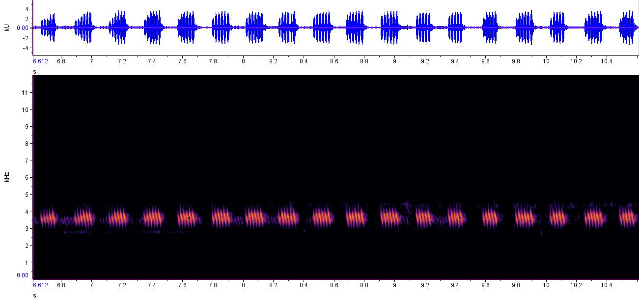 Recorded by: Jim Petranka and Becky Elkin Madison Co. Comment: Individuals were callings from a mowed pasture; were common at the site. At 79F: 6 pulses per chirp; 4-5 chirps per sec; frequency = 3.5 KHZ.