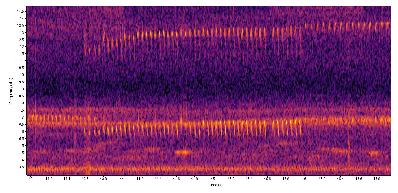 Recorded by: Steve Hall and Bo Sullivan Carteret Co. Comment: 28 syllables per second @ 7.8 kHz. Two trills, with the one to the right combining songs of two different individuals. Trills last between 3.5 to about 5 seconds, with regular pauses between trills; trills rise in both amplitude and pitch, starting as a series of clicks and ending with more musical downslurs. Recorded at the edge of a marsh; calling from on the ground beneath wax myrtles.
