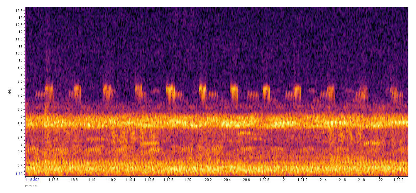 Recorded by: Ken Kneidel Mecklenburg Co. 2020-10-16 71 F, calling from the ground in a weedy area within a detention basin, dominant frequency 7.3 Hz