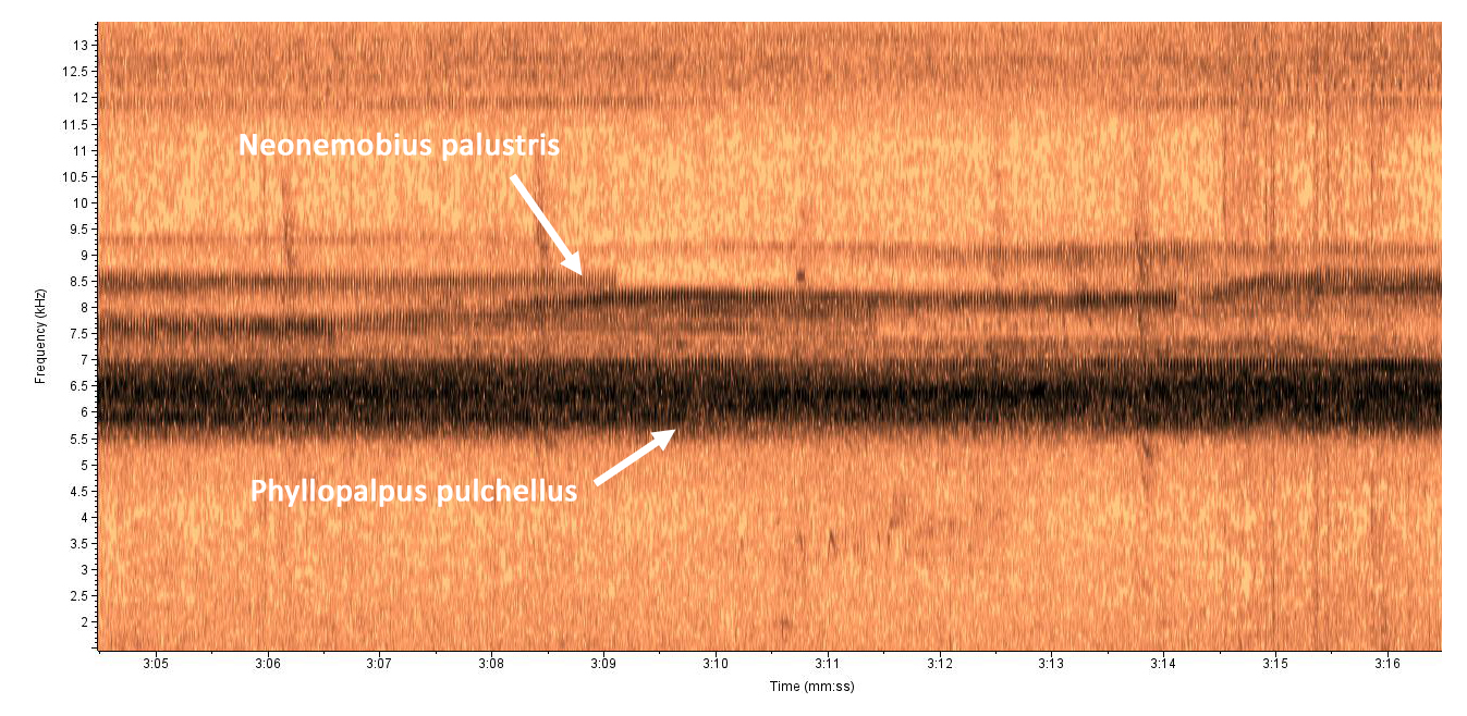 Recorded by: Steve Hall and Bruce Sorrie Richmond Co. Comment: Individual 2. 44.2 syllables per sec @ 9.0 kHz. Recorded in an extensive area of sphagnum located at the north end of a powerline that comes in from the south, intersecting the main powerline ROW Recorded by: Steve Hall and Bruce Sorrie Richmond Co. Comment: Single individual recorded in a seep that had been recently bush-hogged. Sphagnum mats were extensive but mostly dried out and bleached white now Recorded by: Stephen Hall Richmond Co. Comment: Recorded by: Steve Hall Richmond Co. Comment: 38.8 syllables per second at 8.4 kHz Recorded by: Steve Hall Richmond Co. Comment: Recorded on the opposite side of the creek where individuals were observed the previous day. Sphagnum mats were extensive. 38.8 syllables per second at 8.4 kHz Recorded by: Stephen Hall and Mark Basinger Richmond Co. Comment: Recorded by: Stephen Hall and Mark Basinger Richmond Co. Comment: Several flushed from a sphagnum mat Recorded by: Stephen Hall and Mark Basinger Richmond Co. Comment: Several flushed from a sphagnum mat Recorded by: Steve Hall and Bo Sullivan Scotland Co. Comment: At sphagnaceous edge of a streamhead pocosin; recorded along with Allonemobius fultoni. 35 pulses/sec at ~80 F